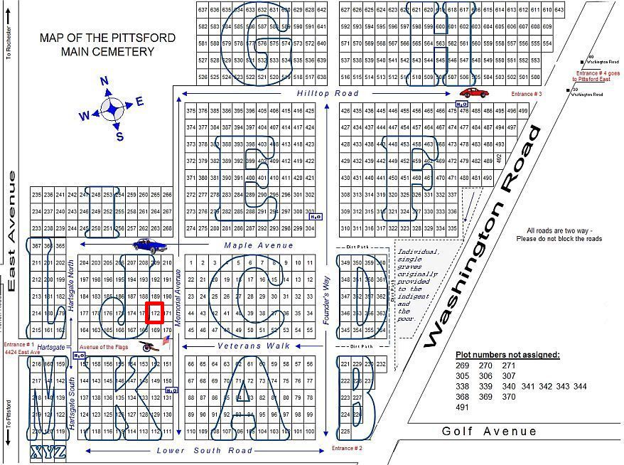 NOTE: In the Main Cemetery, you will find the Wood headstones in: Area J - Lot 172 as shown on the map below.