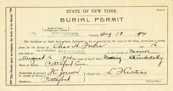 Charles Warren Forbes had a challenging, and short, life. When he was less than one year old, he appeared in court with his mother, Ida Keiling Forbes, who attempted to press a charge of bigamy against his father, Charles Warren Forbes, Sr. Ida had learned she was wife number two of three to whom Charles Sr. had been married. The court must have granted a divorce since Ida married James H. Cummings in 1899. Charles can be found in the 1905 Rochester census as “Warren Cummings”. By then, he had two half-siblings, William and Margaret Cummings. He lived with his mother and stepfather in Rochester for several years. Following his mother’s death from consumption in 1912, Charles went to work on Vernon Welch’s one-hundred-acre farm on Mendon Road. Charles was employed as a farm laborer with Mr. Welch for four years before moving to the Ira Snyder farm and spending the last year of his life at work there. On August 16, 1914 Charles and his friend, Edward Brown of Albion,